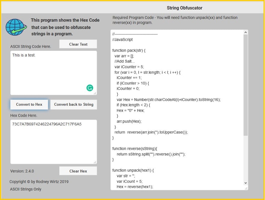 This code converts an ASCII text strings into a series of hexadecimal numbers using a Javascript routine to encode and decode the string. This programming can obfuscate a string that you use in your program’s source code. Then, when the program executes, it can de-obfuscate the string.