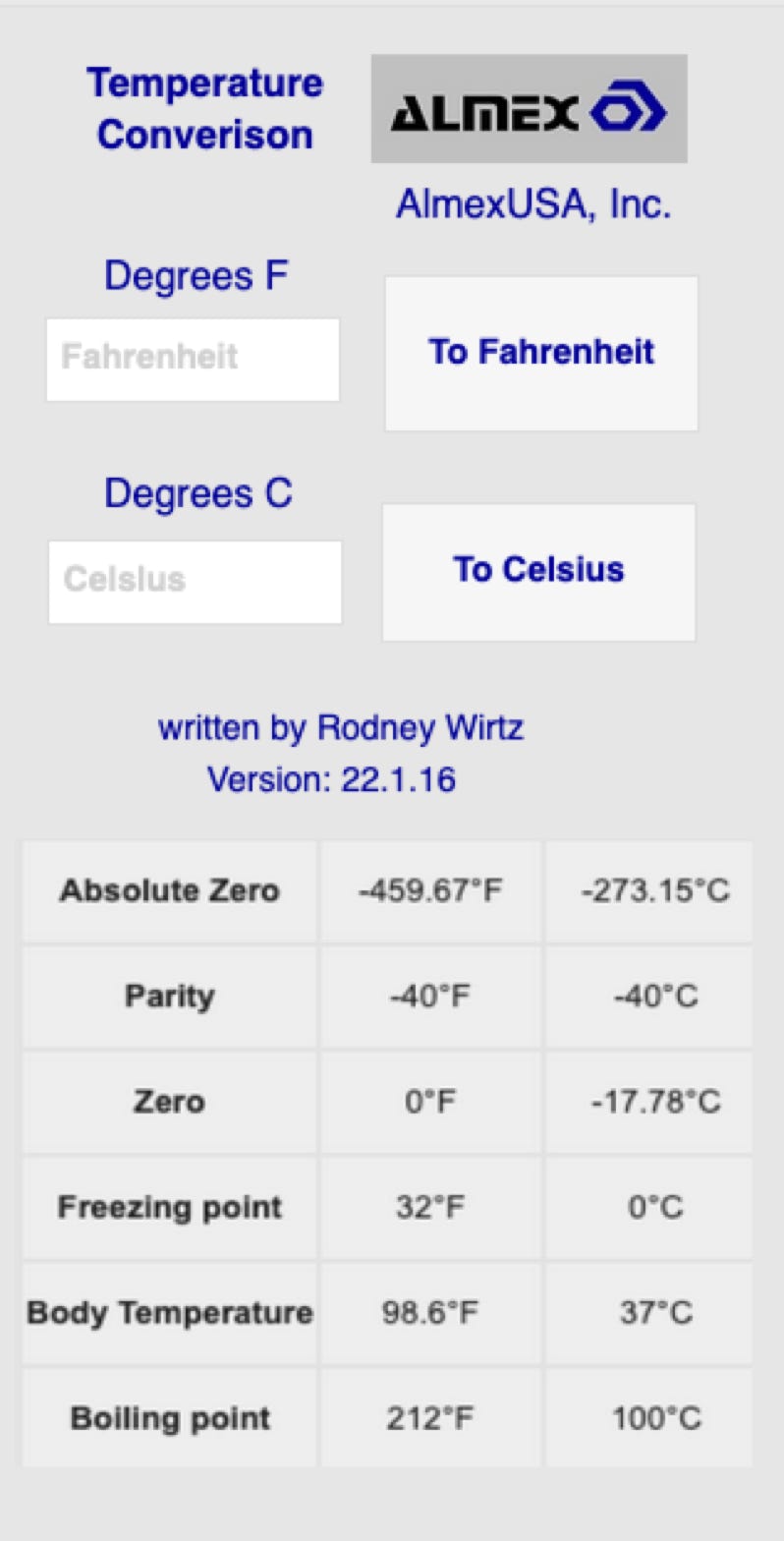 This app is straight forward. It coverts degrees Celsius to Fahrenheit, back and forth.