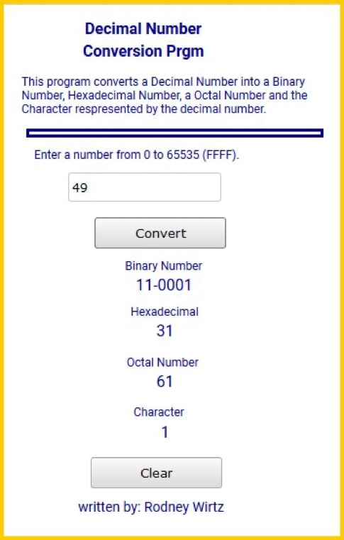 When is the letter A not the letter A? Well, computers don't use the letter A. They use a binary number 01000001 to represent A. This is known as an ASCII representation. In decimal the letter A is 65. When 65 is entered in the program, you should see this binary number and the character (glyph) representation of this letter displayed.